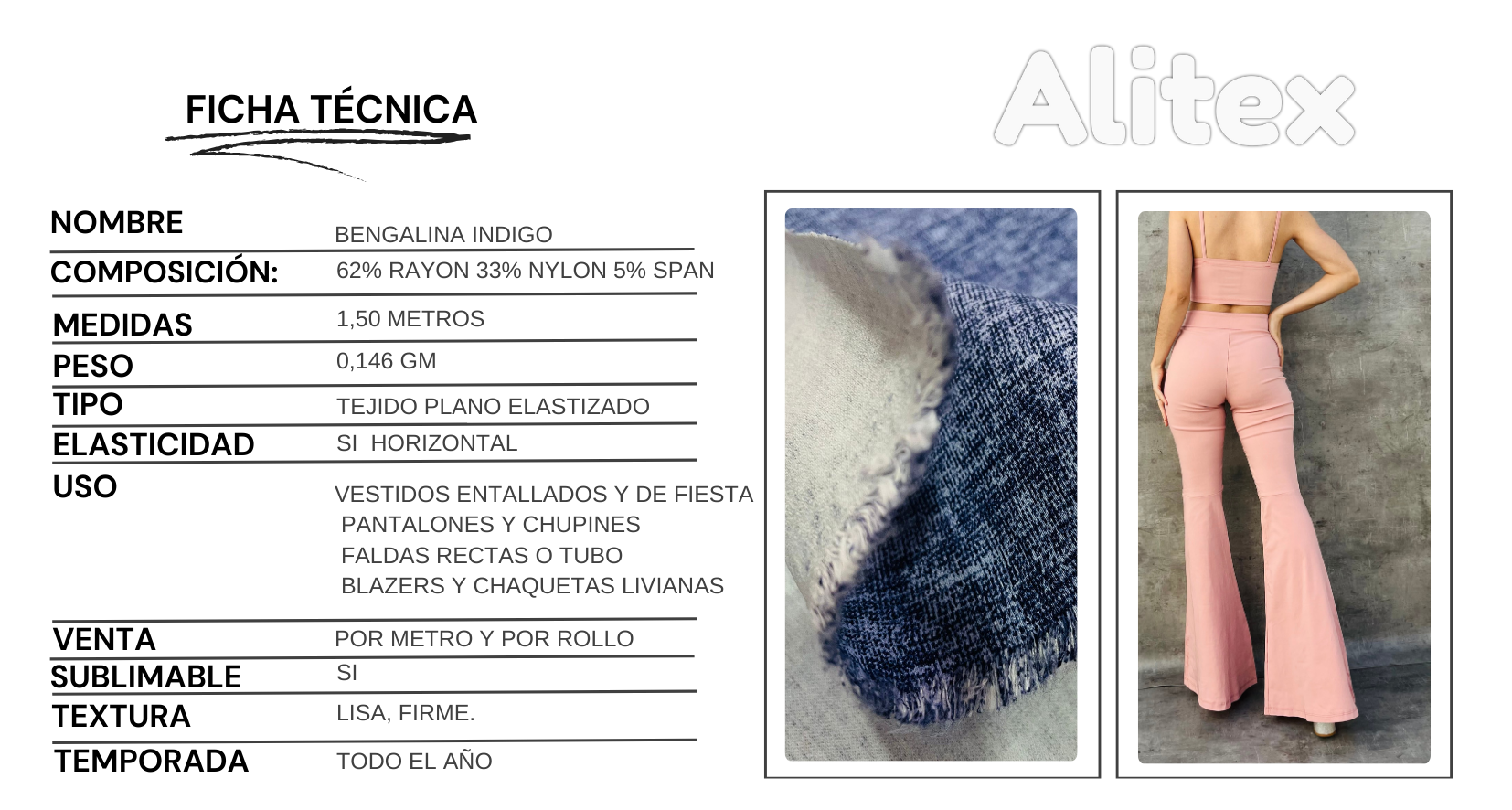 La bengalina Indigo es una tela elastizada, firme y elegante, pensada para prendas que buscan realzar la figura y encantar con un toque melange