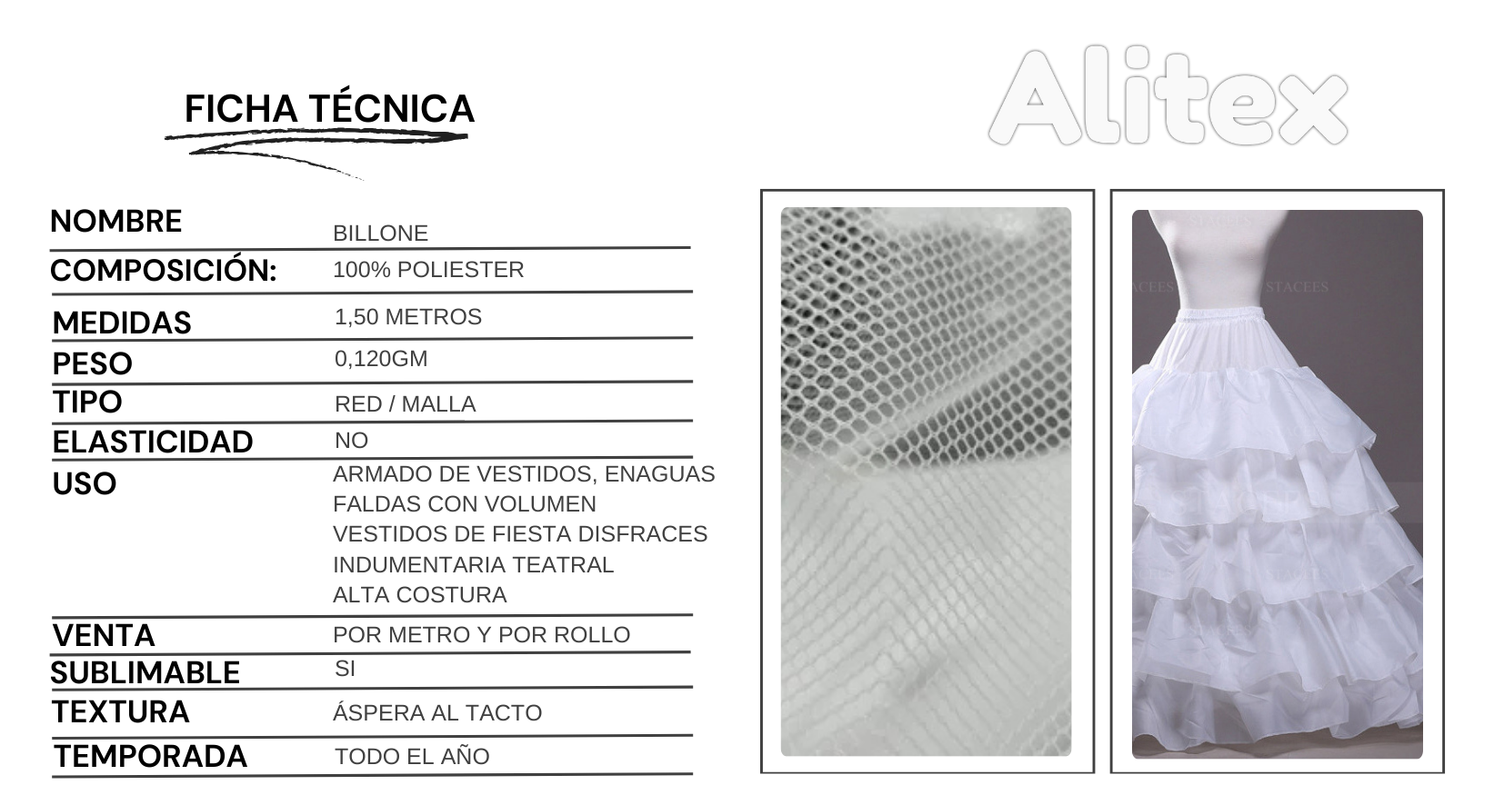 La tela Billóne es una red rígida especialmente utilizada en confección de vestidos, faldas y prendas que necesitan estructura, cuerpo y forma sin sumar peso excesivo.