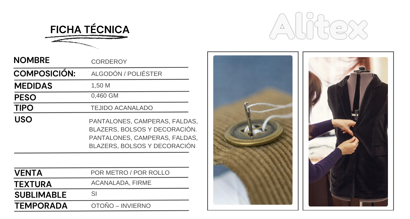 El Corderoy es una tela clásica de textura acanalada, ideal para confecciones de otoño e invierno que requieren estructura, abrigo y estilo atemporal.