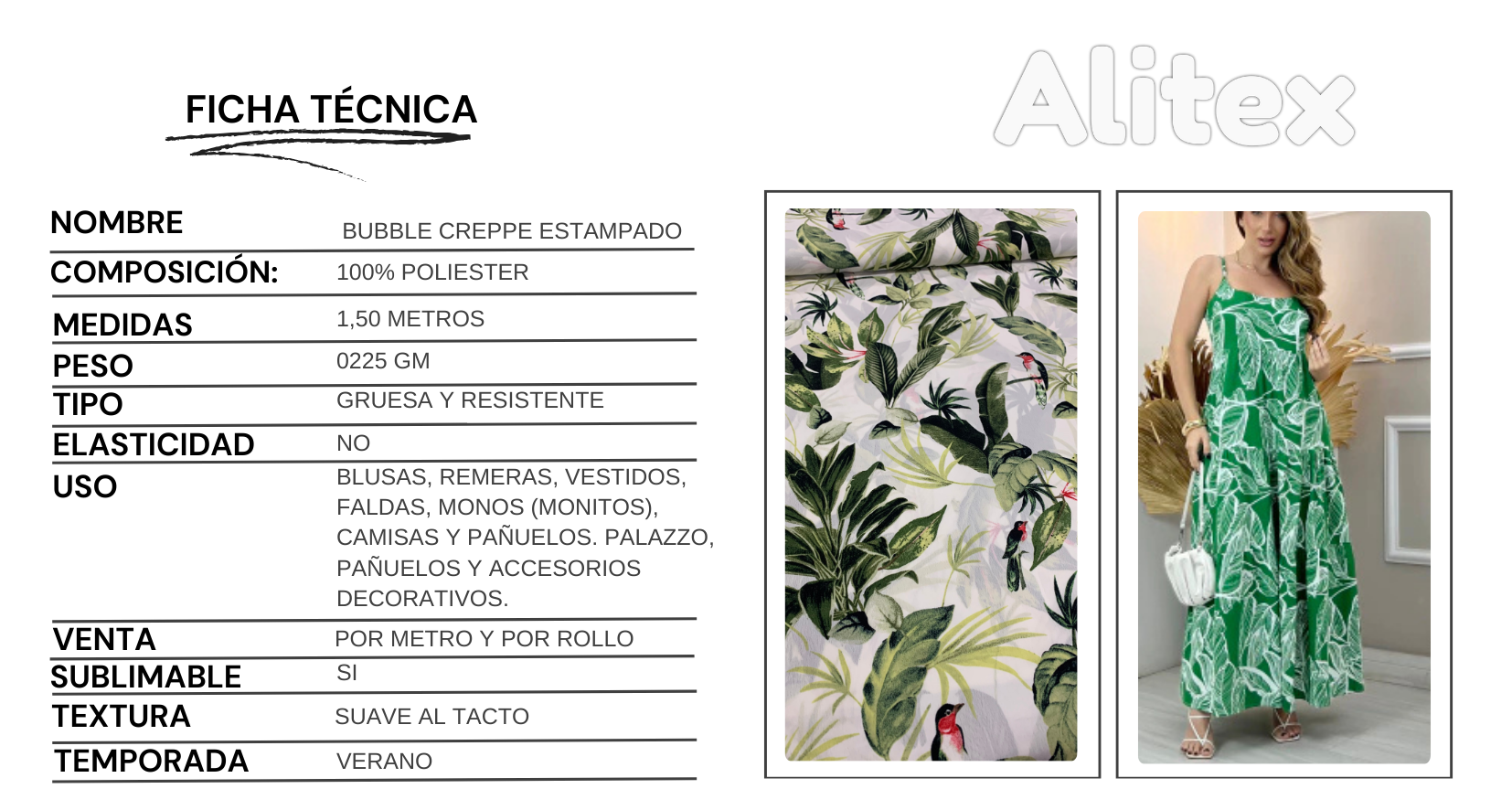 Gracias a su ligereza y fluidez, se adapta perfectamente al cuerpo, logrando prendas con excelente caída y terminaciones prolijas. Los estampados aportan personalidad y diseño, convirtiéndola en una opción versátil para colecciones modernas y atemporales.