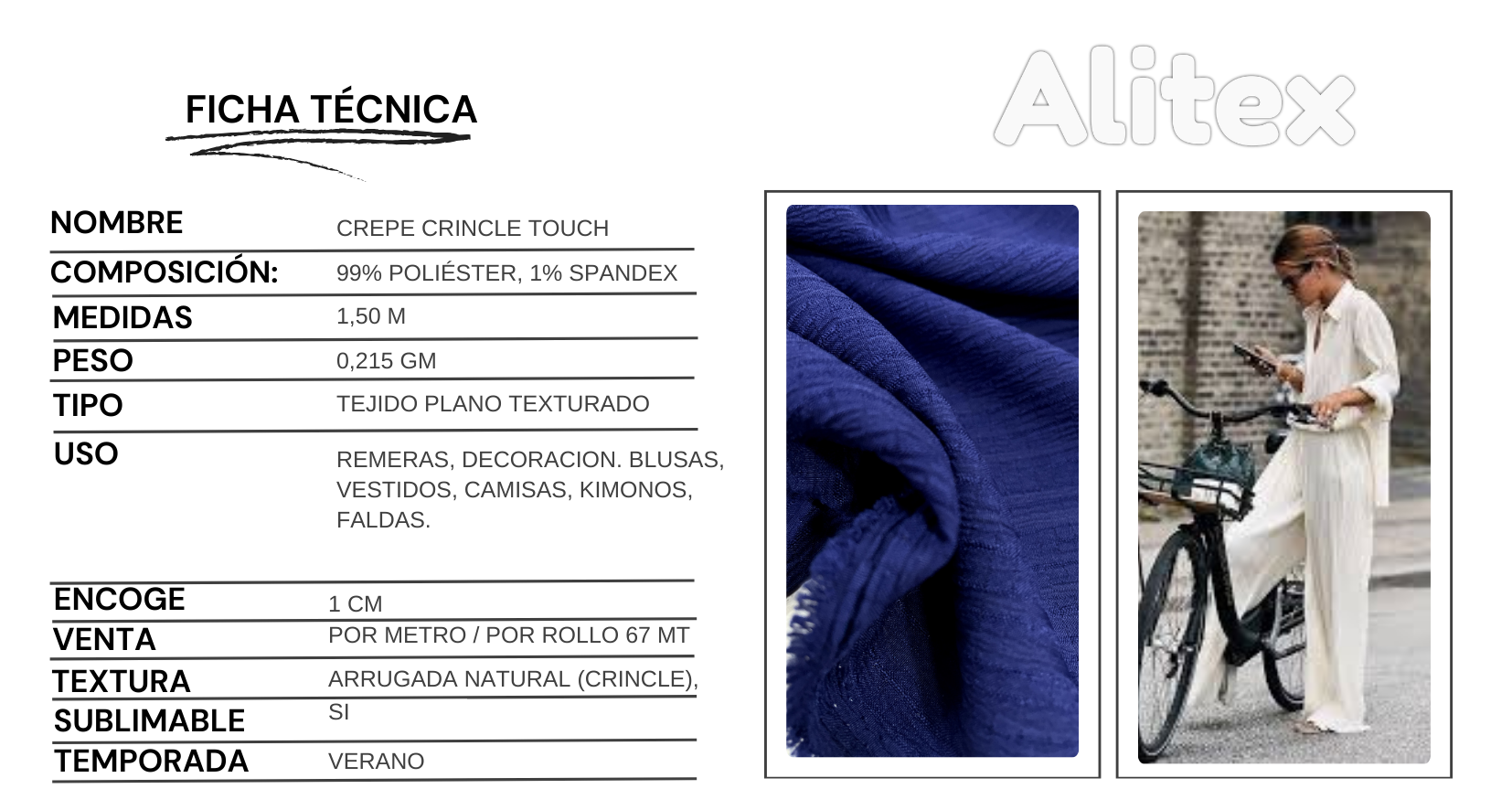Su acabado con leve movimiento y textura irregular le aporta un estilo actual, ideal para prendas frescas, versátiles y con caída fluida. Es una tela que no necesita planchado constante gracias a su efecto texturado, lo que la convierte en una excelente opción para moda práctica y cómoda.