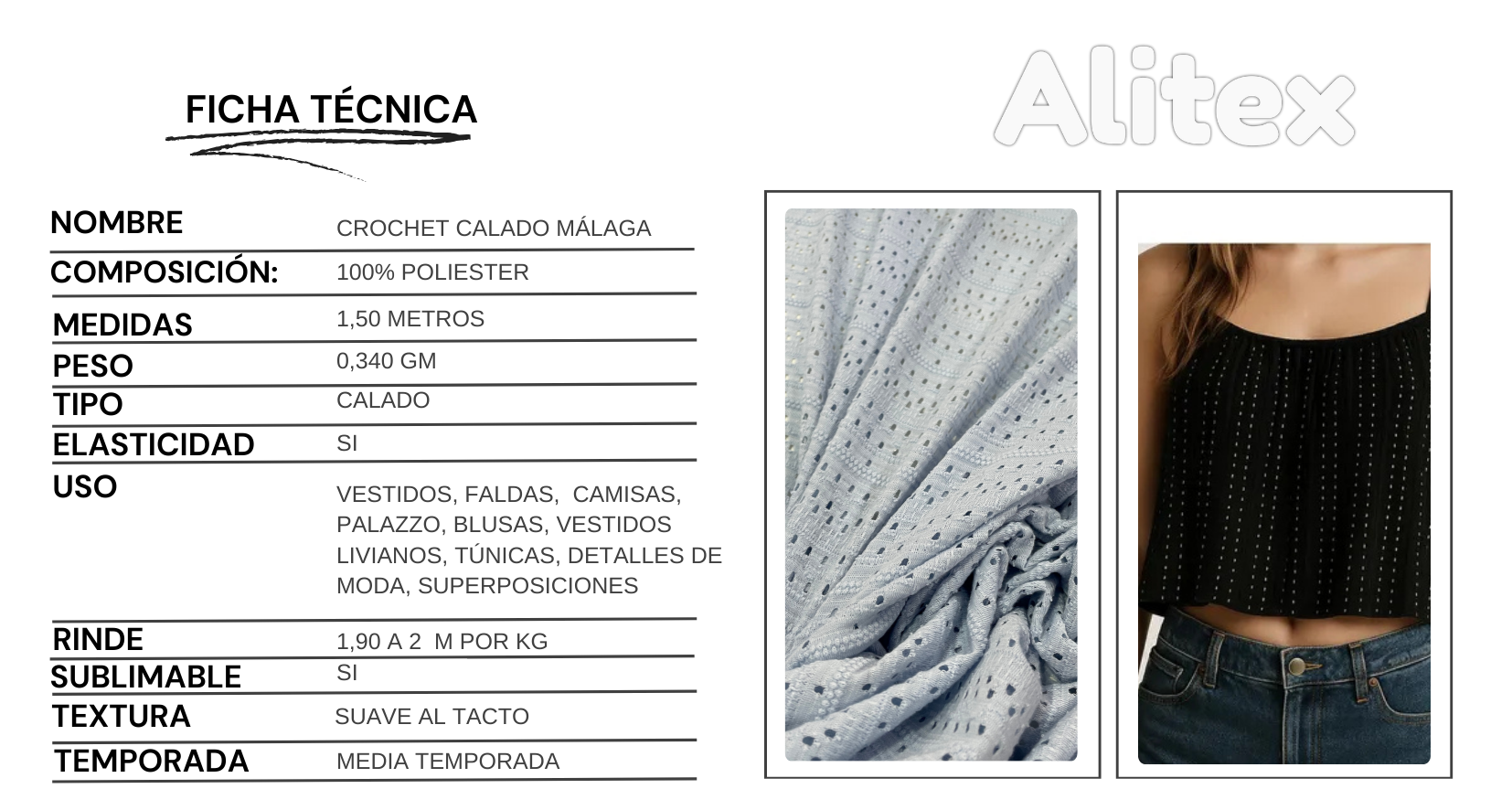 El Crochet Calado Málaga es un tejido liviano con trama abierta tipo encaje, que reproduce la estética del crochet artesanal pero con toda la practicidad de una tela industrial. Su mezcla de poliéster con un toque de spandex le da una suave elasticidad, mayor comodidad y adaptabilidad al cuerpo, sin perder resistencia ni forma con el uso. Perfecta para prendas de entretiempo y looks con textura.