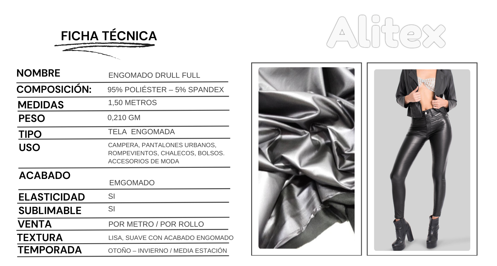 La tela Engomado Drull Full es un material moderno y versátil que combina resistencia, elasticidad y un acabado engomado que aporta un estilo contemporáneo a las prendas.