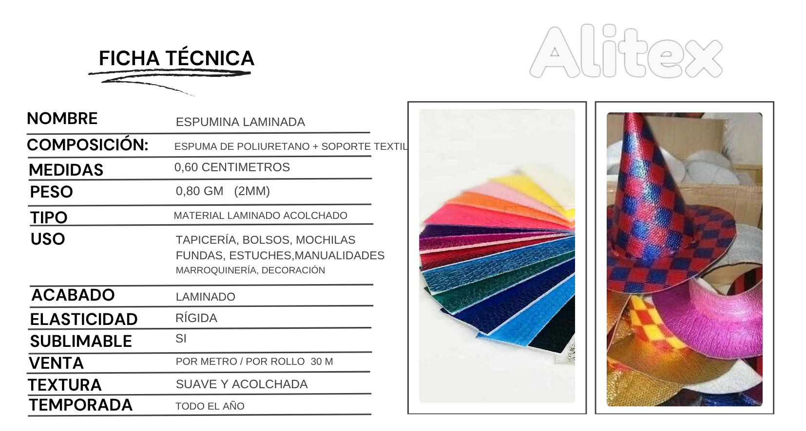 La Espumina Laminada es un material compuesto por una capa de espuma de poliuretano unida a un soporte textil, lo que permite aportar volumen, suavidad y protección en distintos tipos de confección.