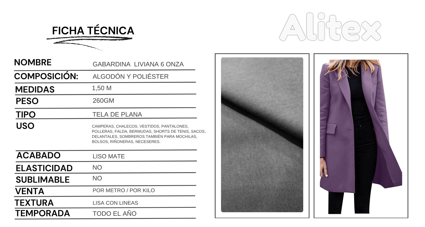 La Gabardina Liviana 6 OZ es una tela plana de alta resistencia, confeccionada en algodón/poliester, que se destaca por su estructura firme y su característico tejido en diagonal, lo que le brinda mayor durabilidad y estabilidad.
