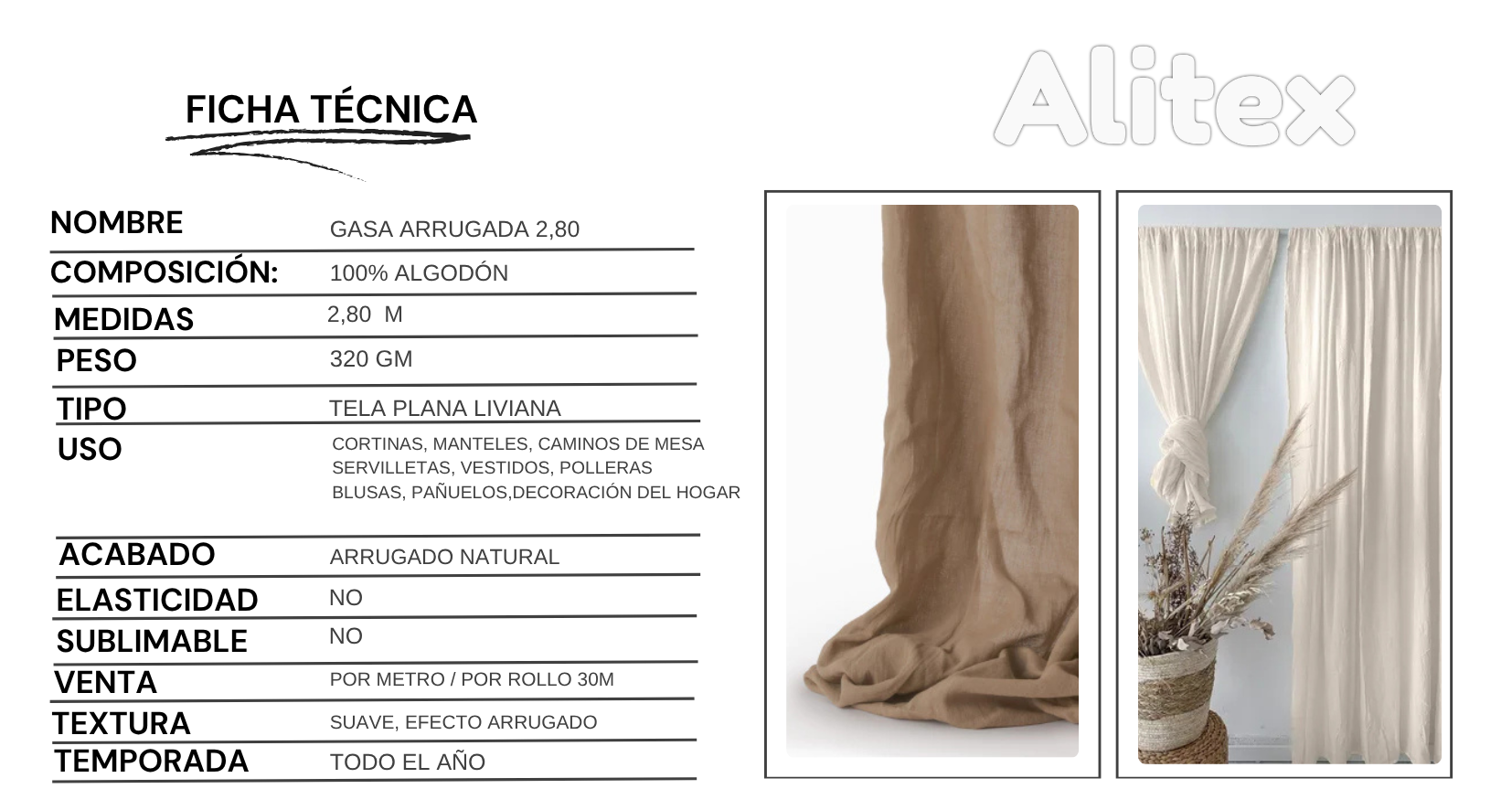 Es una tela muy elegida para confeccionar cortinas, manteles, vestidos, polleras, pañuelos y artículos decorativos, combinando estética y funcionalidad.