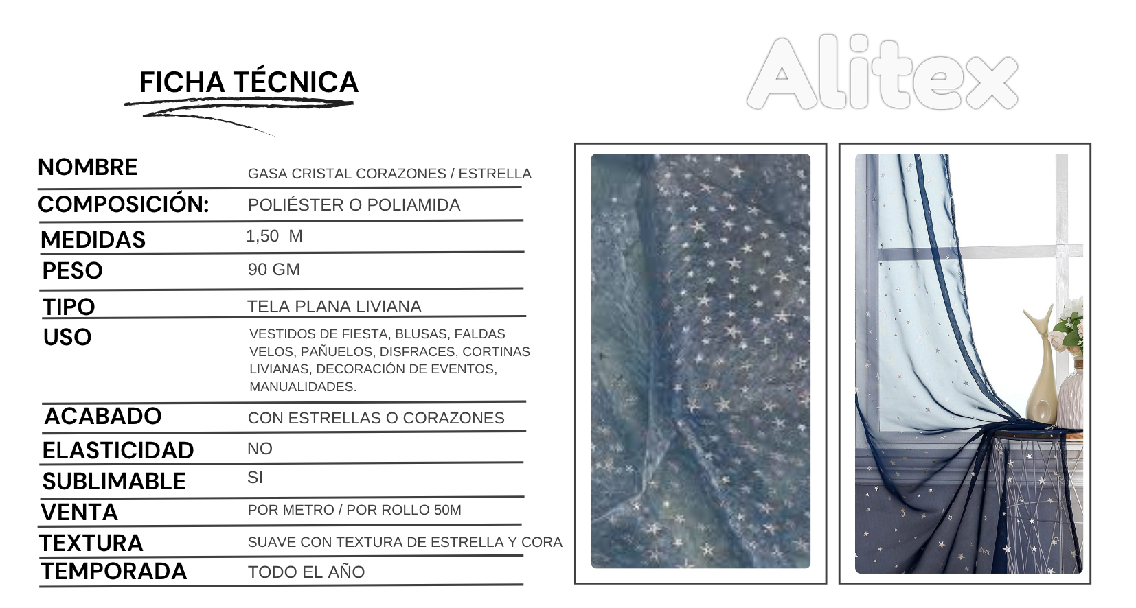 La Gasa Cristal con Estrella es una tela de aspecto delicado que combina la transparencia característica de la gasa cristal con un estampado brillante de estrellas o corazones, generando un efecto visual atractivo y moderno.