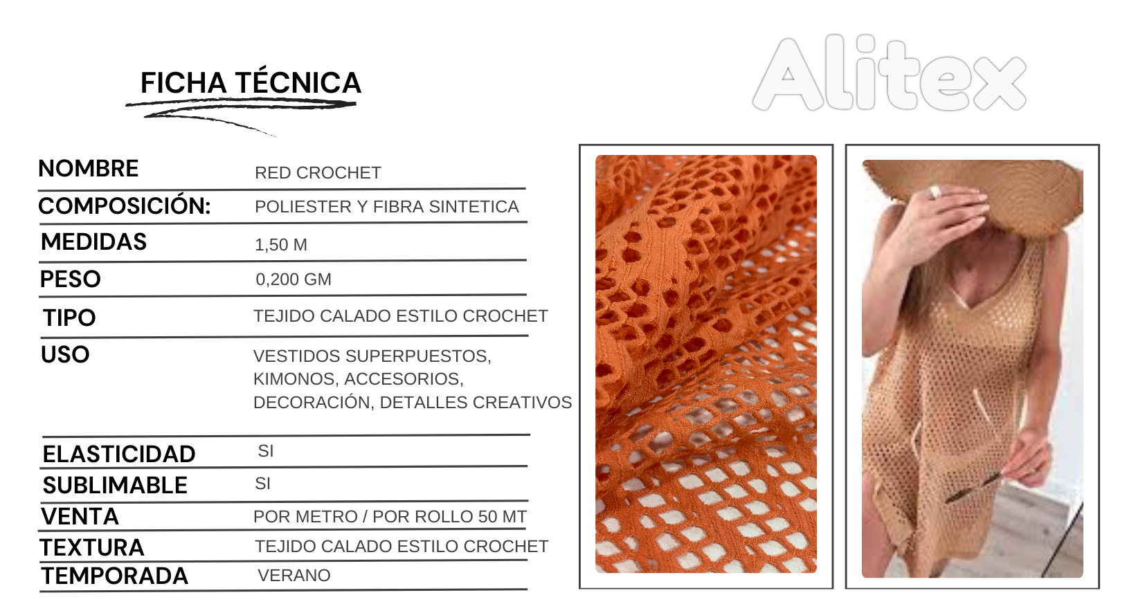 La Red Crochet es un tejido abierto con estructura de malla, inspirado en el estilo artesanal del crochet, ideal para confecciones y proyectos que combinan diseño, textura y ligereza.